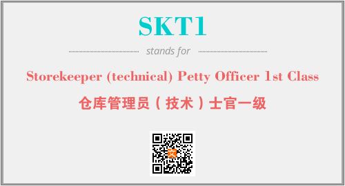 上述内容是“Storekeeper (technical) Petty Officer 1st Class”作为“SKT1”的缩写,解释为“仓库管理员(技术)士官一级”时的信息,以及英文缩略词SKT1所代表的英文单词,其对应的中文拼音、详细解释以及在英文中的流行度和相关分类、应用领域及应用示例等。