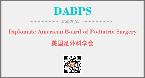英文缩略词“DABPS”经常作为“Diplomate American Board of Podiatric Surgery”的英文缩写来使用,中文表示:“美国足外科学会”。本文将详细介绍英文缩写词DABPS所代表英文单词,其对应的中文拼音、详细解释以及在英语中的流行度。此外,还有关于缩略词DABPS的分类、应用领域及相关应用示例等。