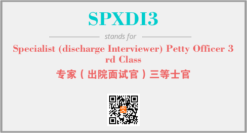 英文缩略词“SPXDI3”经常作为“Specialist (discharge Interviewer) Petty Officer 3rd Class”的英文缩写来使用,中文表示:“专家(出院面试官)三等士官”。本文将详细介绍英文缩写词SPXDI3所代表英文单词,其对应的中文拼音、详细解释以及在英语中的流行度。此外,还有关于缩略词SPXDI3的分类、应用领域及相关应用示例等。