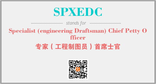 英文缩略词“SPXEDC”经常作为“Specialist (engineering Draftsman) Chief Petty Officer”的英文缩写来使用,中文表示:“专家(工程制图员)首席士官”。本文将详细介绍英文缩写词SPXEDC所代表英文单词,其对应的中文拼音、详细解释以及在英语中的流行度。此外,还有关于缩略词SPXEDC的分类、应用领域及相关应用示例等。