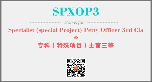 英文缩略词“SPXOP3”经常作为“Specialist (special Project) Petty Officer 3rd Class”的英文缩写来使用,中文表示:“专科(特殊项目)士官三等”。本文将详细介绍英文缩写词SPXOP3所代表英文单词,其对应的中文拼音、详细解释以及在英语中的流行度。此外,还有关于缩略词SPXOP3的分类、应用领域及相关应用示例等。