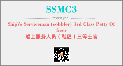 英文缩略词“SSMC3”经常作为“Ship\'s Serviceman (cobbler) 3rd Class Petty Officer”的英文缩写来使用,中文表示:“船上服务人员(鞋匠)三等士官”。本文将详细介绍英文缩写词SSMC3所代表英文单词,其对应的中文拼音、详细解释以及在英语中的流行度。此外,还有关于缩略词SSMC3的分类、应用领域及相关应用示例等。