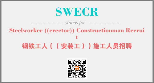 上述内容是“Steelworker ((erector)) Constructionman Recruit”作为“SWECR”的缩写,解释为“钢铁工人((安装工))施工人员招聘”时的信息,以及英文缩略词SWECR所代表的英文单词,其对应的中文拼音、详细解释以及在英文中的流行度和相关分类、应用领域及应用示例等。