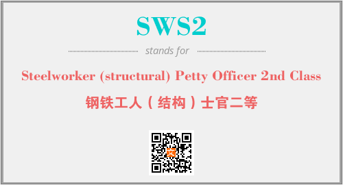 上述内容是“Steelworker (structural) Petty Officer 2nd Class”作为“SWS2”的缩写,解释为“钢铁工人(结构)士官二等”时的信息,以及英文缩略词SWS2所代表的英文单词,其对应的中文拼音、详细解释以及在英文中的流行度和相关分类、应用领域及应用示例等。