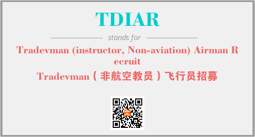 上述内容是“Tradevman (instructor, Non-aviation) Airman Recruit”作为“TDIAR”的缩写,解释为“Tradevman(非航空教员)飞行员招募”时的信息,以及英文缩略词TDIAR所代表的英文单词,其对应的中文拼音、详细解释以及在英文中的流行度和相关分类、应用领域及应用示例等。
