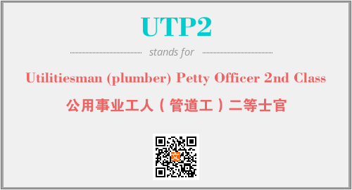 英文缩略词“UTP2”经常作为“Utilitiesman (plumber) Petty Officer 2nd Class”的英文缩写来使用,中文表示:“公用事业工人(管道工)二等士官”。本文将详细介绍英文缩写词UTP2所代表英文单词,其对应的中文拼音、详细解释以及在英语中的流行度。此外,还有关于缩略词UTP2的分类、应用领域及相关应用示例等。