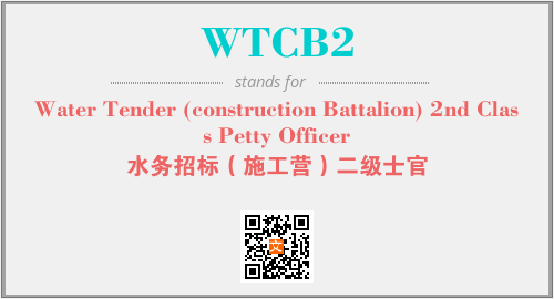 上述内容是“Water Tender (construction Battalion) 2nd Class Petty Officer”作为“WTCB2”的缩写,解释为“水务招标(施工营)二级士官”时的信息,以及英文缩略词WTCB2所代表的英文单词,其对应的中文拼音、详细解释以及在英文中的流行度和相关分类、应用领域及应用示例等。