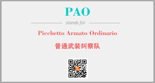 上述内容是“Picchetto Armato Ordinario”作为“PAO”的缩写,解释为“普通武装纠察队”时的信息,以及英文缩略词PAO所代表的英文单词,其对应的中文拼音、详细解释以及在英文中的流行度和相关分类、应用领域及应用示例等。
