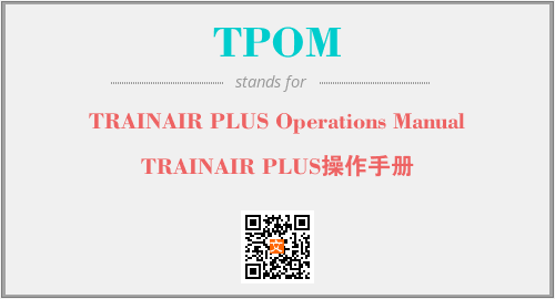 英文缩略词“TPOM”经常作为“TRAINAIR PLUS Operations Manual”的英文缩写来使用,中文表示:“TRAINAIR PLUS操作手册”。本文将详细介绍英文缩写词TPOM所代表英文单词,其对应的中文拼音、详细解释以及在英语中的流行度。此外,还有关于缩略词TPOM的分类、应用领域及相关应用示例等。