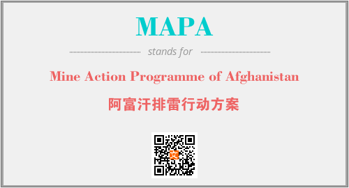 英文缩略词“MAPA”经常作为“Mine Action Programme of Afghanistan”的英文缩写来使用,中文表示:“阿富汗排雷行动方案”。本文将详细介绍英文缩写词MAPA所代表英文单词,其对应的中文拼音、详细解释以及在英语中的流行度。此外,还有关于缩略词MAPA的分类、应用领域及相关应用示例等。