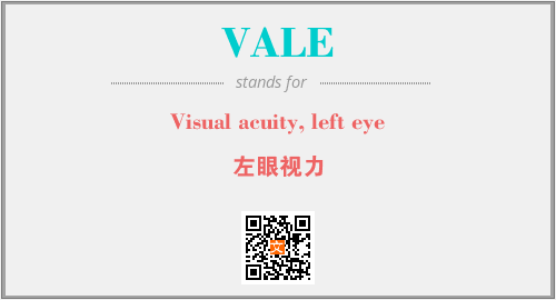 上述内容是“Visual acuity, left eye”作为“VALE”的缩写,解释为“左眼视力”时的信息,以及英文缩略词VALE所代表的英文单词,其对应的中文拼音、详细解释以及在英文中的流行度和相关分类、应用领域及应用示例等。