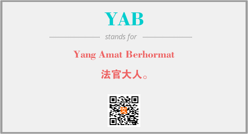 上述内容是“Yang Amat Berhormat”作为“YAB”的缩写,解释为“法官大人。”时的信息,以及英文缩略词YAB所代表的英文单词,其对应的中文拼音、详细解释以及在英文中的流行度和相关分类、应用领域及应用示例等。