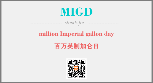 上述内容是“million Imperial gallon day”作为“MIGD”的缩写,解释为“百万英制加仑日”时的信息,以及英文缩略词MIGD所代表的英文单词,其对应的中文拼音、详细解释以及在英文中的流行度和相关分类、应用领域及应用示例等。