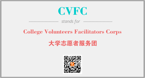 上述内容是“College Volunteers Facilitators Corps”作为“CVFC”的缩写,解释为“大学志愿者服务团”时的信息,以及英文缩略词CVFC所代表的英文单词,其对应的中文拼音、详细解释以及在英文中的流行度和相关分类、应用领域及应用示例等。