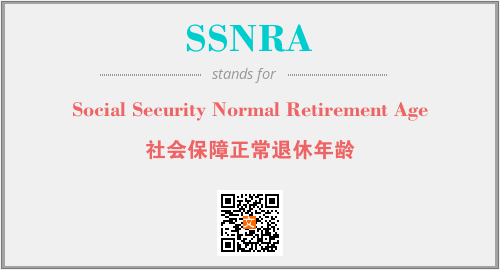 英文缩略词“SSNRA”经常作为“Social Security Normal Retirement Age”的英文缩写来使用,中文表示:“社会保障正常退休年龄”。本文将详细介绍英文缩写词SSNRA所代表英文单词,其对应的中文拼音、详细解释以及在英语中的流行度。此外,还有关于缩略词SSNRA的分类、应用领域及相关应用示例等。