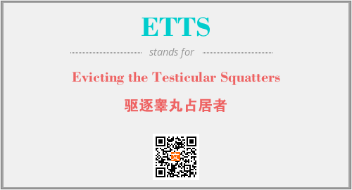 英文缩略词“ETTS”经常作为“Evicting the Testicular Squatters”的英文缩写来使用,中文表示:“驱逐睾丸占居者”。本文将详细介绍英文缩写词ETTS所代表英文单词,其对应的中文拼音、详细解释以及在英语中的流行度。此外,还有关于缩略词ETTS的分类、应用领域及相关应用示例等。
