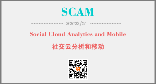 上述内容是“Social Cloud Analytics and Mobile”作为“SCAM”的缩写,解释为“社交云分析和移动”时的信息,以及英文缩略词SCAM所代表的英文单词,其对应的中文拼音、详细解释以及在英文中的流行度和相关分类、应用领域及应用示例等。