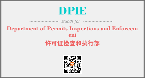 英文缩略词“DPIE”经常作为“Department of Permits Inspections and Enforcement”的英文缩写来使用,中文表示:“许可证检查和执行部”。本文将详细介绍英文缩写词DPIE所代表英文单词,其对应的中文拼音、详细解释以及在英语中的流行度。此外,还有关于缩略词DPIE的分类、应用领域及相关应用示例等。