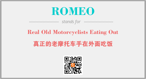 英文缩略词“ROMEO”经常作为“Real Old Motorcyclists Eating Out”的英文缩写来使用,中文表示:“真正的老摩托车手在外面吃饭”。本文将详细介绍英文缩写词ROMEO所代表英文单词,其对应的中文拼音、详细解释以及在英语中的流行度。此外,还有关于缩略词ROMEO的分类、应用领域及相关应用示例等。