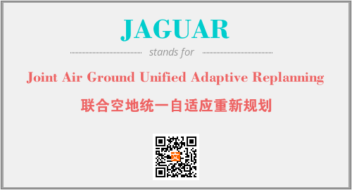 上述内容是“Joint Air Ground Unified Adaptive Replanning”作为“JAGUAR”的缩写,解释为“联合空地统一自适应重新规划”时的信息,以及英文缩略词JAGUAR所代表的英文单词,其对应的中文拼音、详细解释以及在英文中的流行度和相关分类、应用领域及应用示例等。