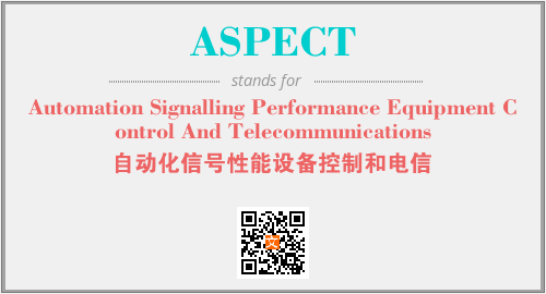 上述内容是“Automation Signalling Performance Equipment Control And Telecommunications”作为“ASPECT”的缩写,解释为“自动化信号性能设备控制和电信”时的信息,以及英文缩略词ASPECT所代表的英文单词,其对应的中文拼音、详细解释以及在英文中的流行度和相关分类、应用领域及应用示例等。