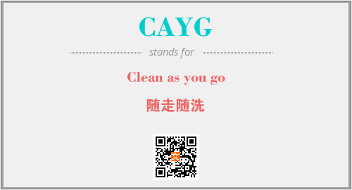 上述内容是“Clean as you go”作为“CAYG”的缩写,解释为“随走随洗”时的信息,以及英文缩略词CAYG所代表的英文单词,其对应的中文拼音、详细解释以及在英文中的流行度和相关分类、应用领域及应用示例等。
