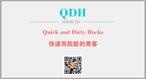 上述内容是“Quick and Dirty Hacks”作为“QDH”的缩写,解释为“快速而肮脏的黑客”时的信息,以及英文缩略词QDH所代表的英文单词,其对应的中文拼音、详细解释以及在英文中的流行度和相关分类、应用领域及应用示例等。