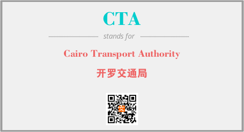 上述内容是“Cairo Transport Authority”作为“CTA”的缩写,解释为“开罗交通局”时的信息,以及英文缩略词CTA所代表的英文单词,其对应的中文拼音、详细解释以及在英文中的流行度和相关分类、应用领域及应用示例等。