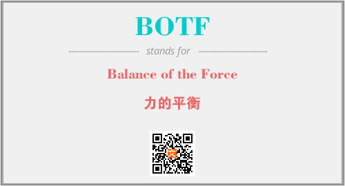 上述内容是“Balance of the Force”作为“BOTF”的缩写,解释为“力的平衡”时的信息,以及英文缩略词BOTF所代表的英文单词,其对应的中文拼音、详细解释以及在英文中的流行度和相关分类、应用领域及应用示例等。