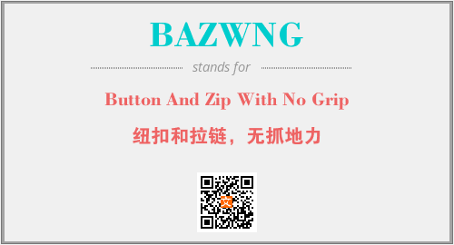 上述内容是“Button And Zip With No Grip”作为“BAZWNG”的缩写,解释为“纽扣和拉链,无抓地力”时的信息,以及英文缩略词BAZWNG所代表的英文单词,其对应的中文拼音、详细解释以及在英文中的流行度和相关分类、应用领域及应用示例等。