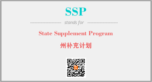英文缩略词“SSP”经常作为“State Supplement Program”的英文缩写来使用,中文表示:“州补充计划”。本文将详细介绍英文缩写词SSP所代表英文单词,其对应的中文拼音、详细解释以及在英语中的流行度。此外,还有关于缩略词SSP的分类、应用领域及相关应用示例等。