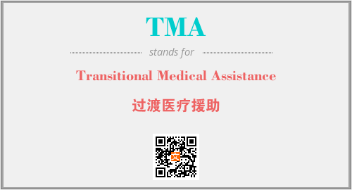 英文缩略词“TMA”经常作为“Transitional Medical Assistance”的英文缩写来使用,中文表示:“过渡医疗援助”。本文将详细介绍英文缩写词TMA所代表英文单词,其对应的中文拼音、详细解释以及在英语中的流行度。此外,还有关于缩略词TMA的分类、应用领域及相关应用示例等。