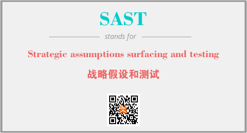 英文缩略词“SAST”经常作为“Strategic assumptions surfacing and testing”的英文缩写来使用,中文表示:“战略假设和测试”。本文将详细介绍英文缩写词SAST所代表英文单词,其对应的中文拼音、详细解释以及在英语中的流行度。此外,还有关于缩略词SAST的分类、应用领域及相关应用示例等。