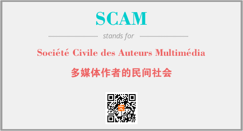 上述内容是“Société Civile des Auteurs Multimédia”作为“SCAM”的缩写,解释为“多媒体作者的民间社会”时的信息,以及英文缩略词SCAM所代表的英文单词,其对应的中文拼音、详细解释以及在英文中的流行度和相关分类、应用领域及应用示例等。