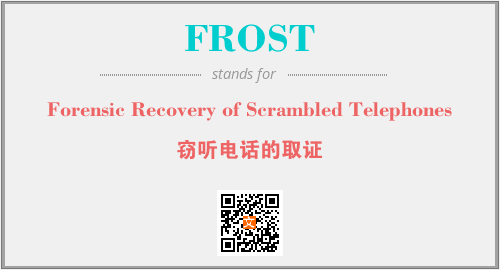 上述内容是“Forensic Recovery of Scrambled Telephones”作为“FROST”的缩写,解释为“窃听电话的取证”时的信息,以及英文缩略词FROST所代表的英文单词,其对应的中文拼音、详细解释以及在英文中的流行度和相关分类、应用领域及应用示例等。