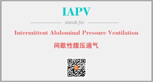 英文缩略词“IAPV”经常作为“Intermittent Abdominal Pressure Ventilation”的英文缩写来使用,中文表示:“间歇性腹压通气”。本文将详细介绍英文缩写词IAPV所代表英文单词,其对应的中文拼音、详细解释以及在英语中的流行度。此外,还有关于缩略词IAPV的分类、应用领域及相关应用示例等。