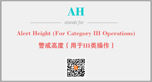 上述内容是“Alert Height (For Category III Operations)”作为“AH”的缩写,解释为“警戒高度(用于III类操作)”时的信息,以及英文缩略词AH所代表的英文单词,其对应的中文拼音、详细解释以及在英文中的流行度和相关分类、应用领域及应用示例等。