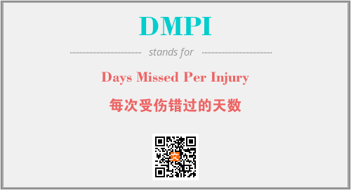 上述内容是“Days Missed Per Injury”作为“DMPI”的缩写,解释为“每次受伤错过的天数”时的信息,以及英文缩略词DMPI所代表的英文单词,其对应的中文拼音、详细解释以及在英文中的流行度和相关分类、应用领域及应用示例等。