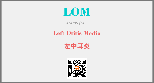 上述内容是“Left Otitis Media”作为“LOM”的缩写,解释为“左中耳炎”时的信息,以及英文缩略词LOM所代表的英文单词,其对应的中文拼音、详细解释以及在英文中的流行度和相关分类、应用领域及应用示例等。