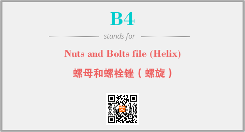 英文缩略词“B4”经常作为“Nuts and Bolts file (Helix)”的英文缩写来使用,中文表示:“螺母和螺栓锉(螺旋)”。本文将详细介绍英文缩写词B4所代表英文单词,其对应的中文拼音、详细解释以及在英语中的流行度。此外,还有关于缩略词B4的分类、应用领域及相关应用示例等。