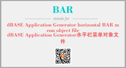 上述内容是“dBASE Application Generator horizontal BAR menu object file”作为“BAR”的缩写,解释为“dBASE Application Generator水平栏菜单对象文件”时的信息,以及英文缩略词BAR所代表的英文单词,其对应的中文拼音、详细解释以及在英文中的流行度和相关分类、应用领域及应用示例等。