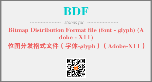 上述内容是“Bitmap Distribution Format file (font - glyph) (Adobe - X11)”作为“BDF”的缩写,解释为“位图分发格式文件(字体-glyph)(Adobe-X11)”时的信息,以及英文缩略词BDF所代表的英文单词,其对应的中文拼音、详细解释以及在英文中的流行度和相关分类、应用领域及应用示例等。