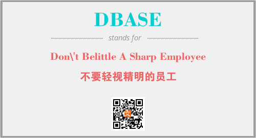 上述内容是“Don\'t Belittle A Sharp Employee”作为“DBASE”的缩写,解释为“不要轻视精明的员工”时的信息,以及英文缩略词DBASE所代表的英文单词,其对应的中文拼音、详细解释以及在英文中的流行度和相关分类、应用领域及应用示例等。