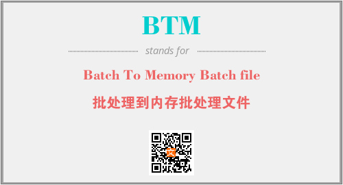 英文缩略词“BTM”经常作为“Batch To Memory Batch file”的英文缩写来使用,中文表示:“批处理到内存批处理文件”。本文将详细介绍英文缩写词BTM所代表英文单词,其对应的中文拼音、详细解释以及在英语中的流行度。此外,还有关于缩略词BTM的分类、应用领域及相关应用示例等。