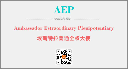 上述内容是“Ambassador Estraordinary Plenipotentiary”作为“AEP”的缩写,解释为“埃斯特拉普通全权大使”时的信息,以及英文缩略词AEP所代表的英文单词,其对应的中文拼音、详细解释以及在英文中的流行度和相关分类、应用领域及应用示例等。