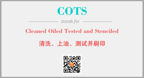 上述内容是“Cleaned Oiled Tested and Stenciled”作为“COTS”的缩写,解释为“清洗、上油、测试并刷印”时的信息,以及英文缩略词COTS所代表的英文单词,其对应的中文拼音、详细解释以及在英文中的流行度和相关分类、应用领域及应用示例等。