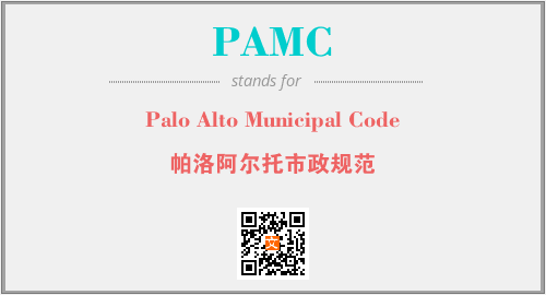 上述内容是“Palo Alto Municipal Code”作为“PAMC”的缩写,解释为“帕洛阿尔托市政规范”时的信息,以及英文缩略词PAMC所代表的英文单词,其对应的中文拼音、详细解释以及在英文中的流行度和相关分类、应用领域及应用示例等。