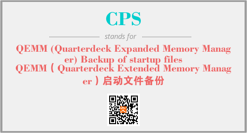 上述内容是“QEMM (Quarterdeck Expanded Memory Manager) Backup of startup files”作为“CPS”的缩写,解释为“QEMM(Quarterdeck Extended Memory Manager)启动文件备份”时的信息,以及英文缩略词CPS所代表的英文单词,其对应的中文拼音、详细解释以及在英文中的流行度和相关分类、应用领域及应用示例等。