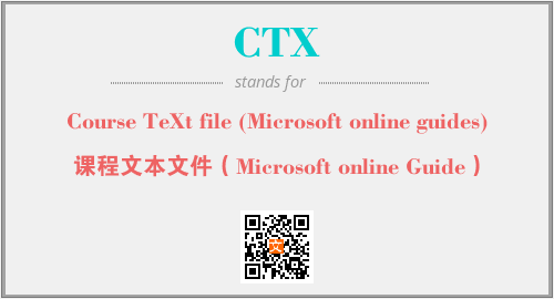 上述内容是“Course TeXt file (Microsoft online guides)”作为“CTX”的缩写,解释为“课程文本文件(Microsoft online Guide)”时的信息,以及英文缩略词CTX所代表的英文单词,其对应的中文拼音、详细解释以及在英文中的流行度和相关分类、应用领域及应用示例等。