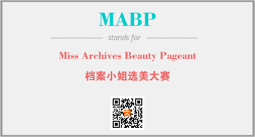 英文缩略词“MABP”经常作为“Miss Archives Beauty Pageant”的英文缩写来使用,中文表示:“档案小姐选美大赛”。本文将详细介绍英文缩写词MABP所代表英文单词,其对应的中文拼音、详细解释以及在英语中的流行度。此外,还有关于缩略词MABP的分类、应用领域及相关应用示例等。